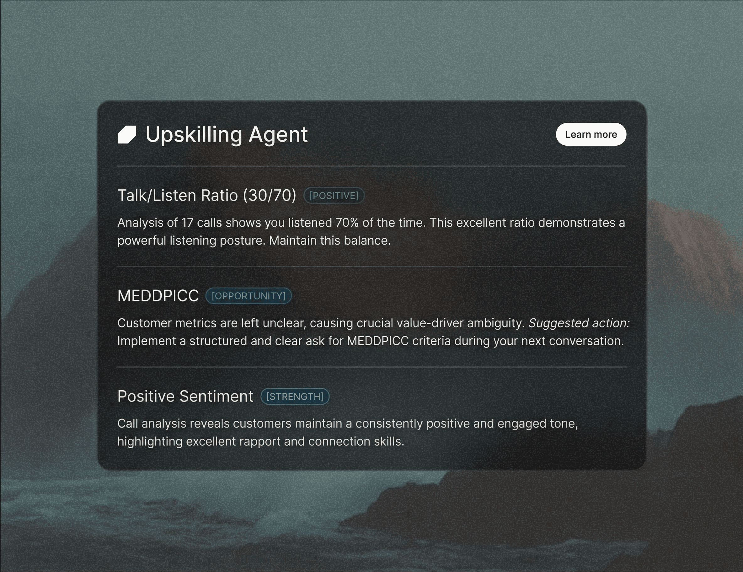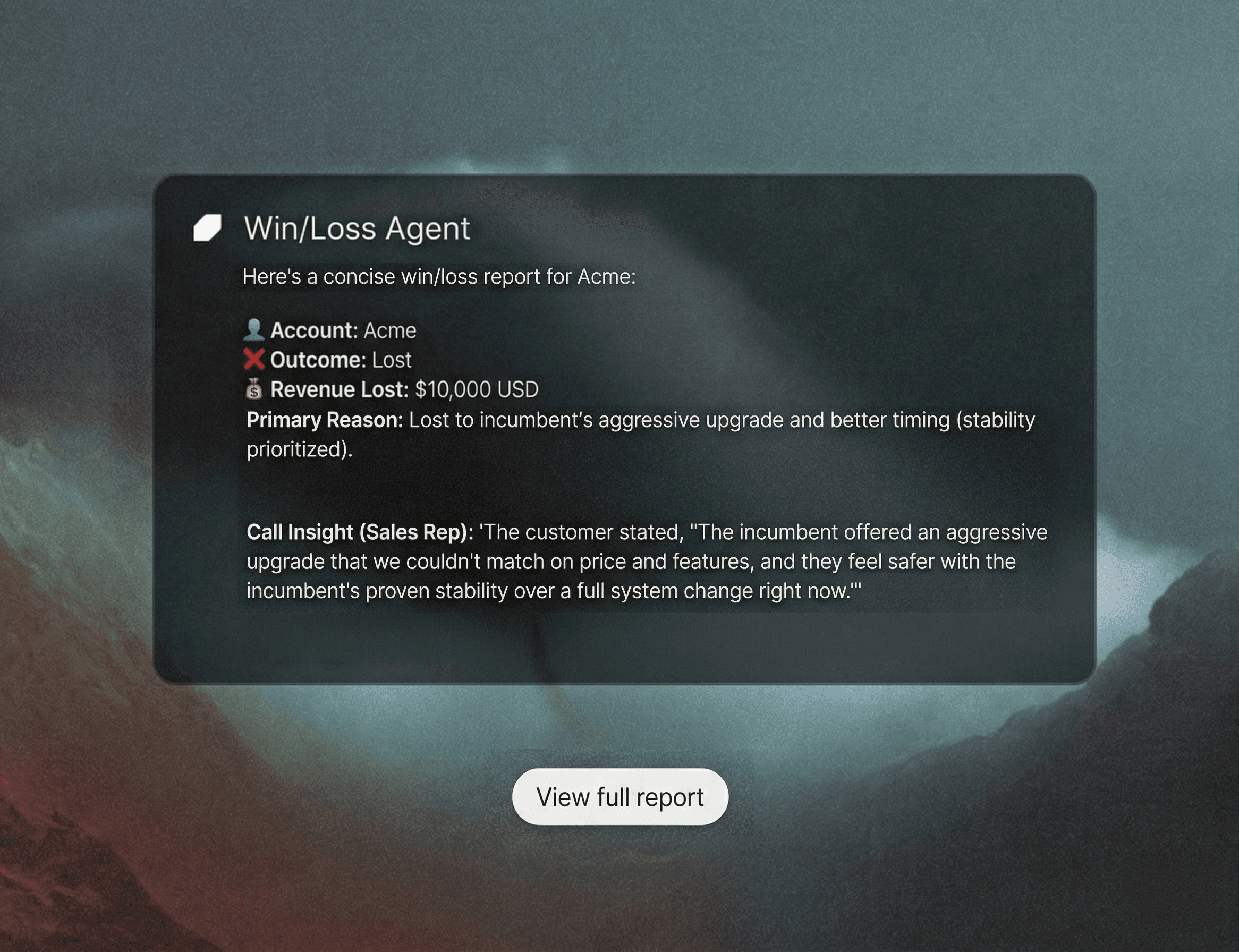 Agents run background workflows autonomously. They audit deal health, account health and categorize Win/Loss reasons with zero human management.